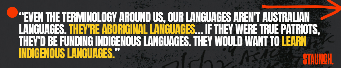 Jimmy challenges how Aboriginal people are pushed to the margins of society and the monopoly of ‘Australian identity’, he says, “Even the terminology around us, our languages aren't Australian languages. They're Aboriginal languages… If they were true patriots, they’d be funding Indigenous languages. They would want to learn Indigenous languages.”