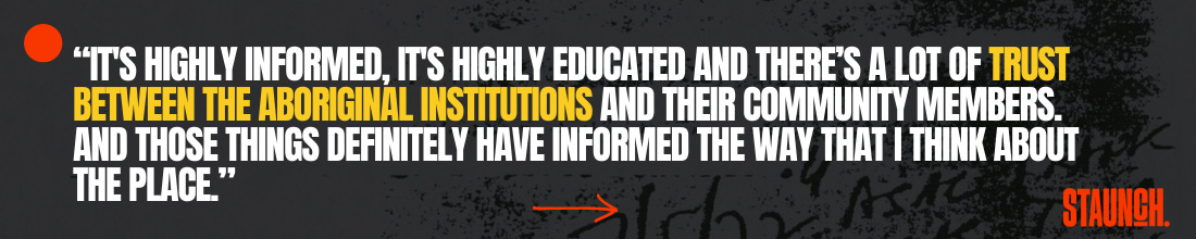 “It's highly informed, it's highly educated and there’s a lot of trust between the Aboriginal institutions and their community members. And those things definitely have informed the way that I think about the place.”