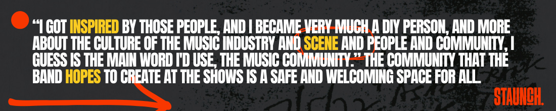 “I got inspired by those people, and I became very much a DIY person, and more about the culture of the music industry and scene and people and community, I guess is the main word I'd use, the music community.” The community that the band hopes to create at the shows is a safe and welcoming space for all.